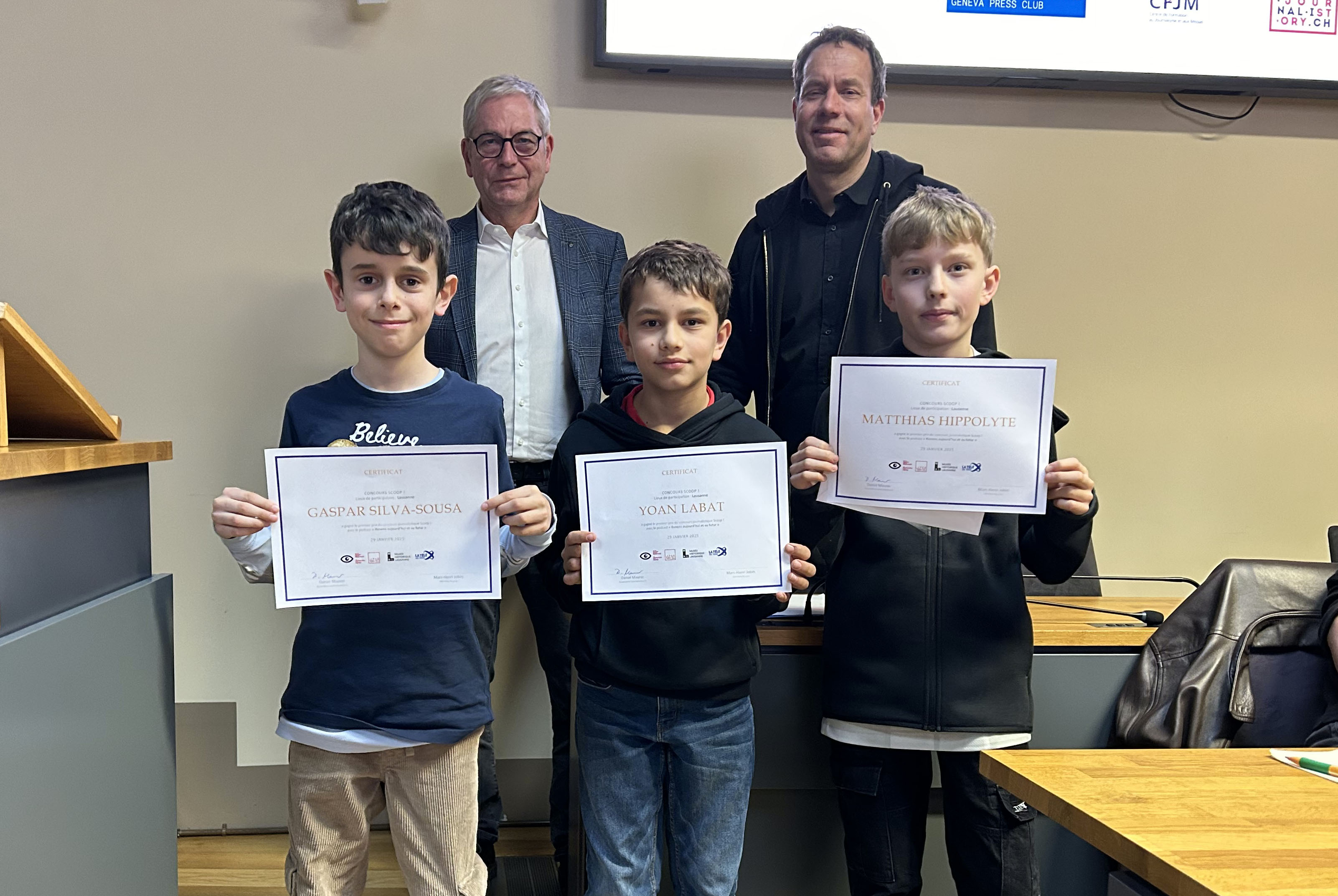 de gauche à droite : Christelle Maillard (Canal Alpha), Robin Rufener (1er prix), Magaux Krieg (prix spécial), Daniel Maurer (Journalistory), Adrien Juvet (RTN)